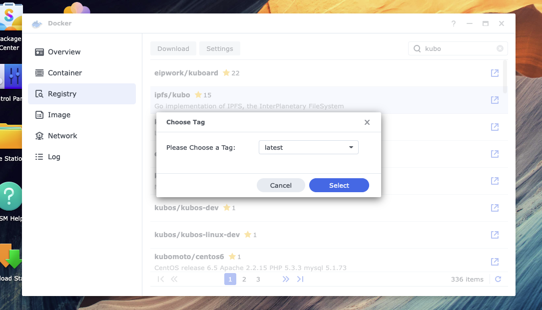 Step 3 - Open Docker app, go to “Registry” and find “ipfs/kubo”, leave the tag as “latest” and click “Select” to install IPFS node software.