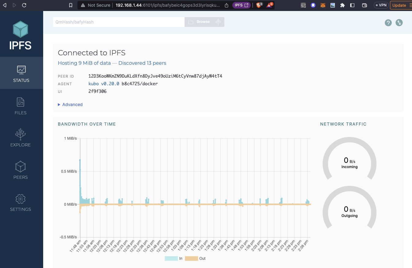 To access the webui of IPFS, we will need to visit “https://<your-synology-server-subnet-address>:<docker-assigned-port-for-5001>/webui”. So you will need to find out which address in your home router your synology is running on first. Mine is running on “192.168.1.44” so to visit the webui, I will need to visit “