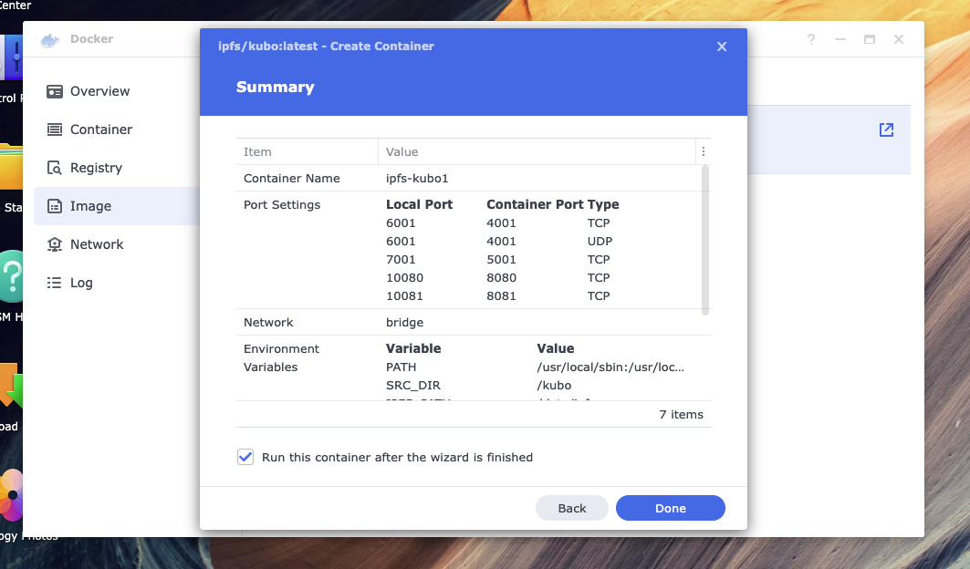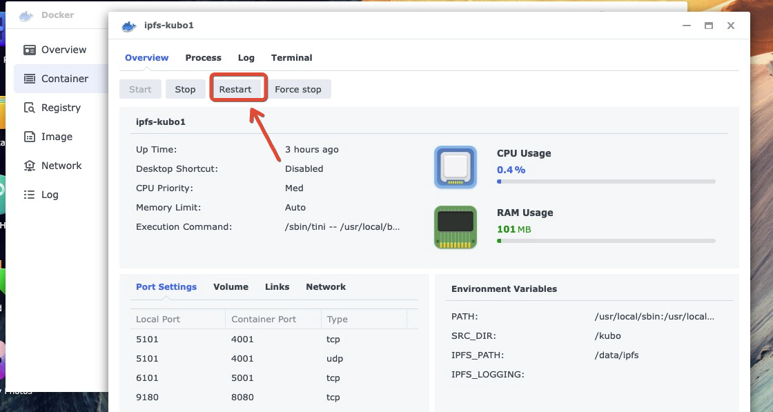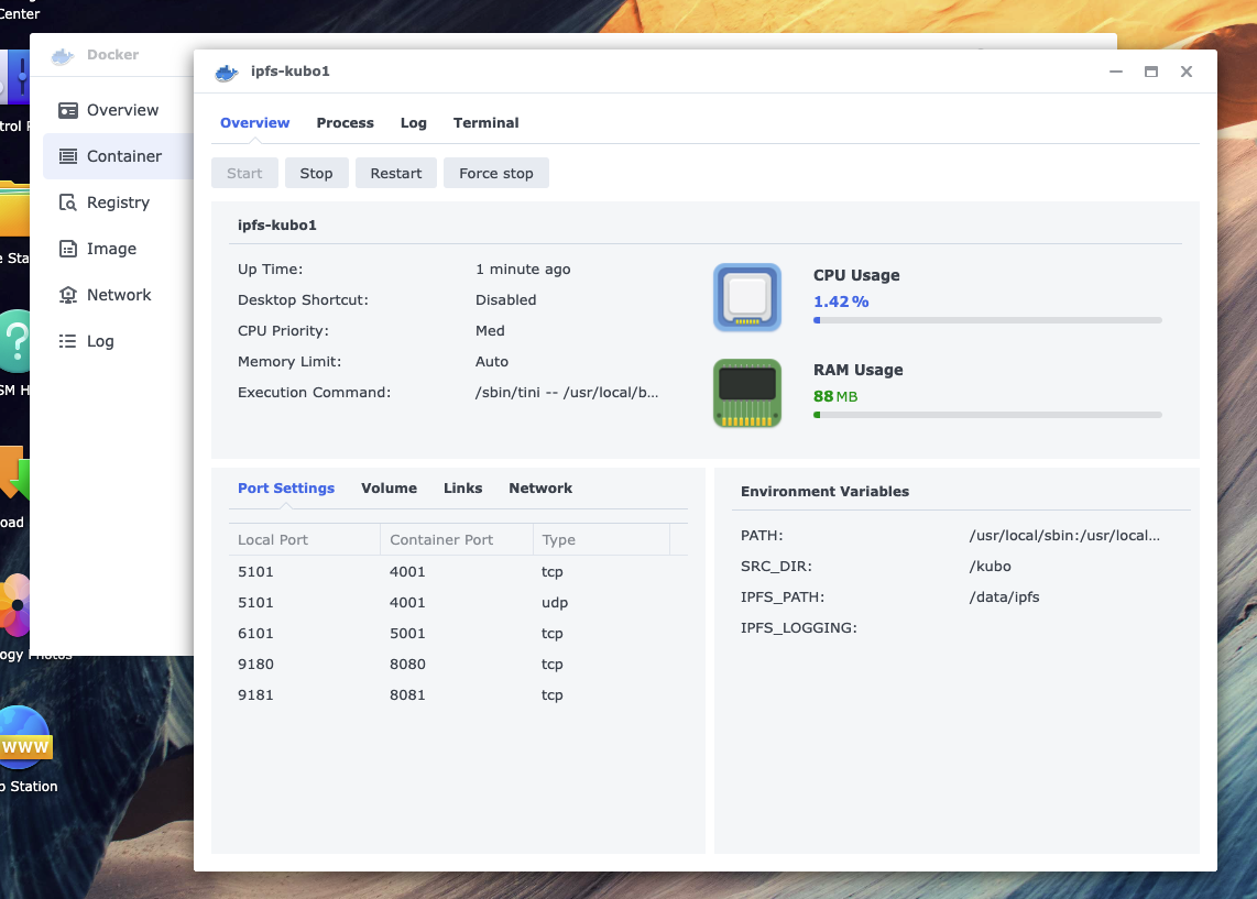 Congratulations! You now have IPFS running on your Synology home server. Double click on the running container to see the details. You'll notice port 49159 is assigned to kubo’s webui port 5001.
