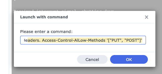 Repeat the same process for the second command ipfs config --json API. HTTPHeaders. Access-Control-Allow-Methods '["PUT", "POST"]'.