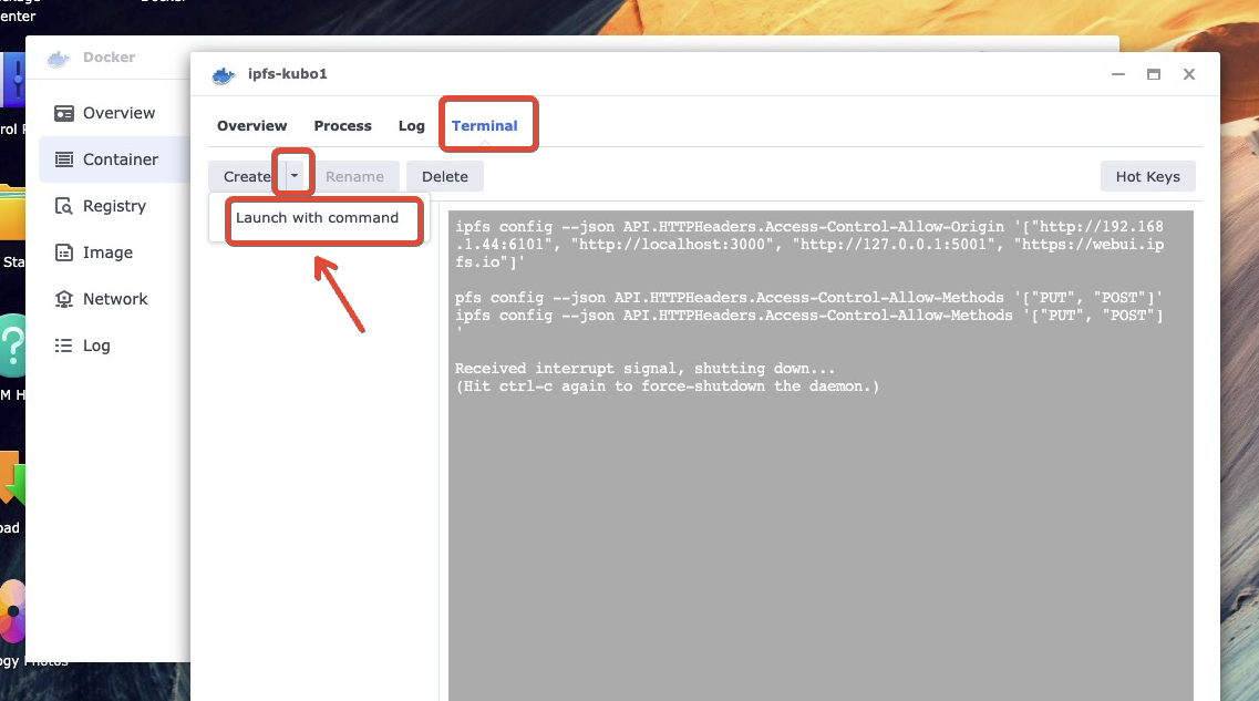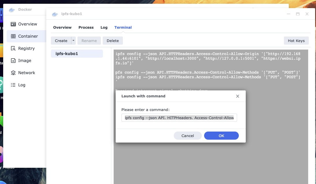 HTTPHeaders. Access-Control-Allow-Origin '[http://192.168.1.44:49159", "http://localhost:3000", "http://127.0.0.1…. Go to “Terminal” in the ipfs-kubo1 settings page, click on the down arrow and select “Launch with command”.