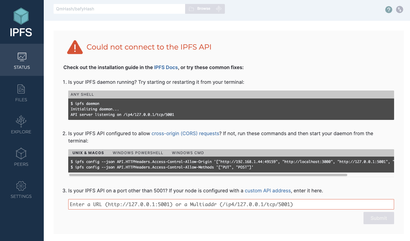 Upon loading, you might notice an error. The webui page is experiencing CORS issues when making API calls. We need to configure the IPFS daemon to accept CORS API calls from sources other than localhost or 127.0.0.1.