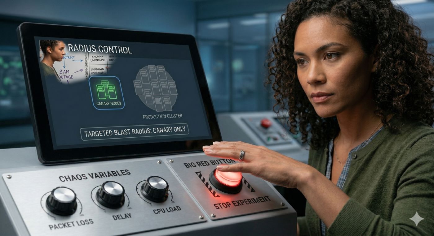 Instead of hitting the main cluster, we target a single canary group or just one non-critical microservice. |