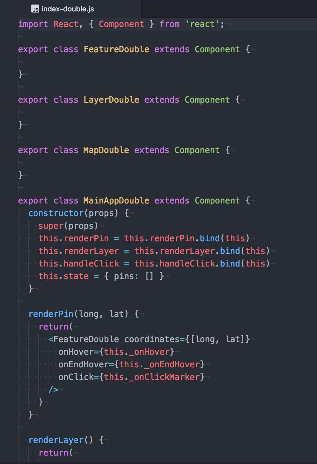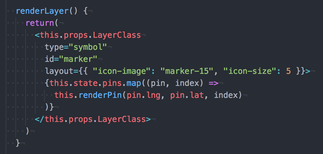 - Then you are calling renderLayer (which renders a layer of pins on the map)