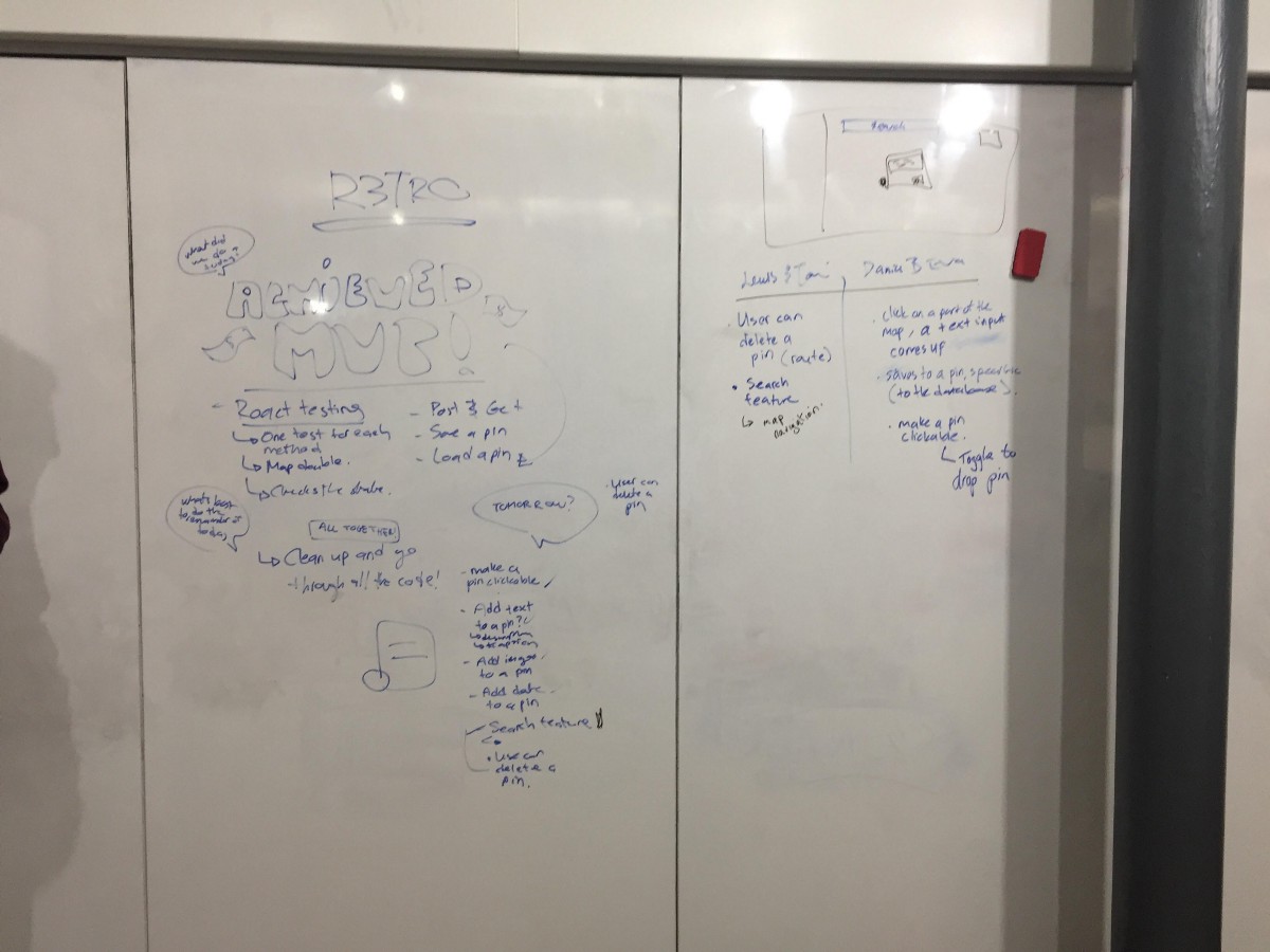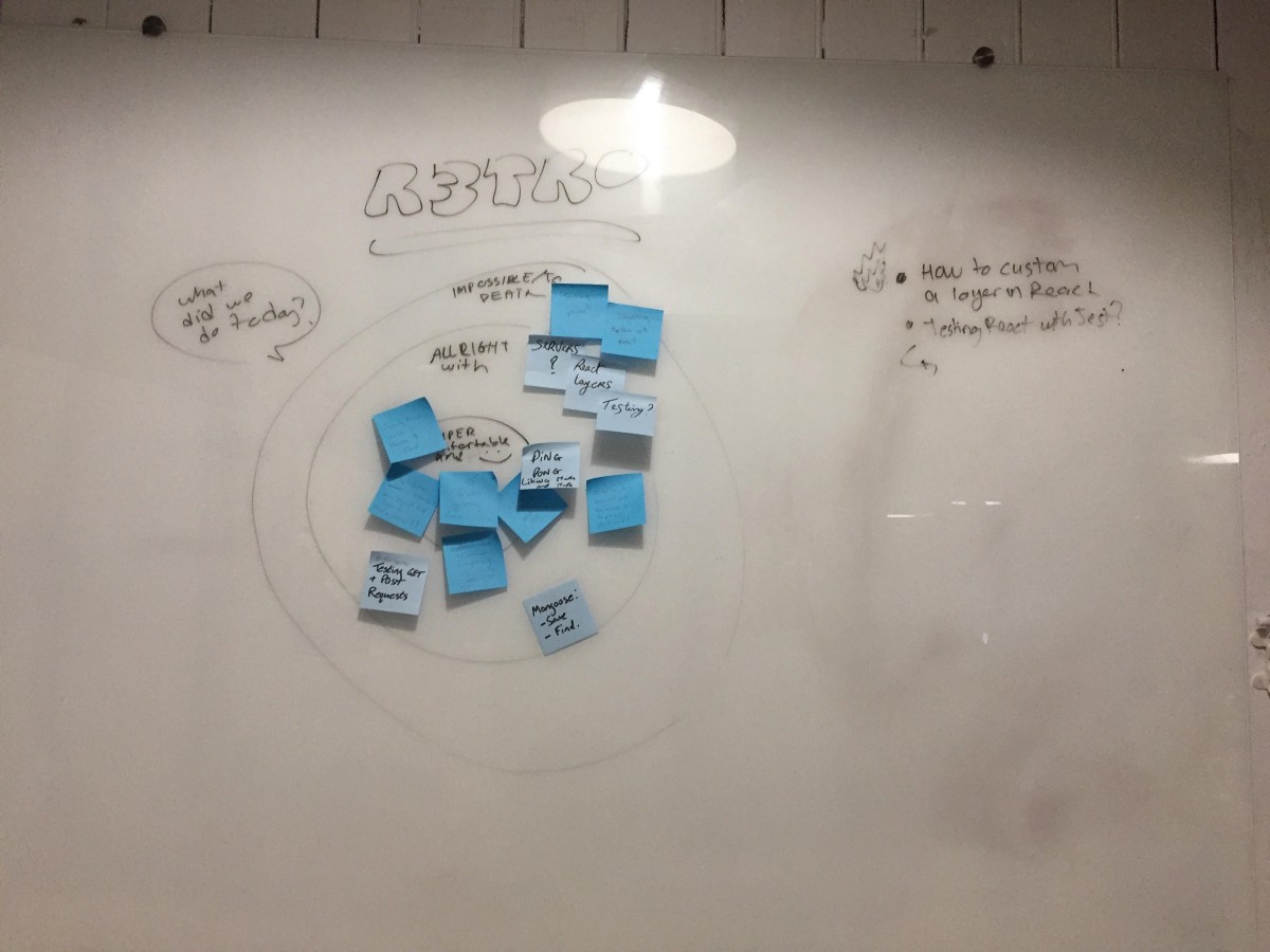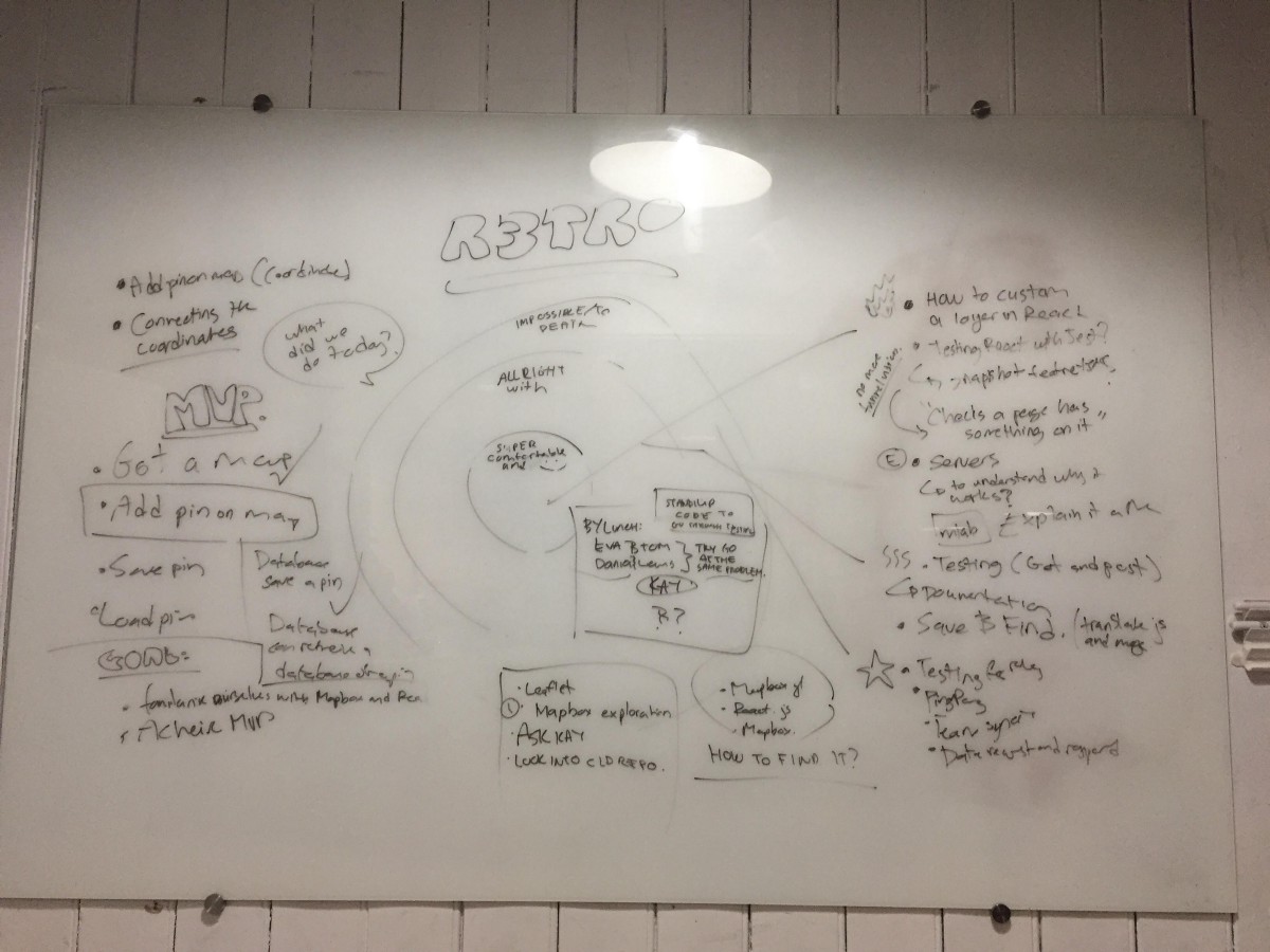 Our first retro we had listed all the rough patches of what we could not figure out. Half of us, otherwise a pair of us got some progress with the back-end testing. Those with React got nowhere, whether it was testing or integrating MapBox with React. A good way I suggested to categorise our struggles and some successes was to do a venn diagram with sticky notes. Our struggles were the outside circle whilst the inside was the sucesses.