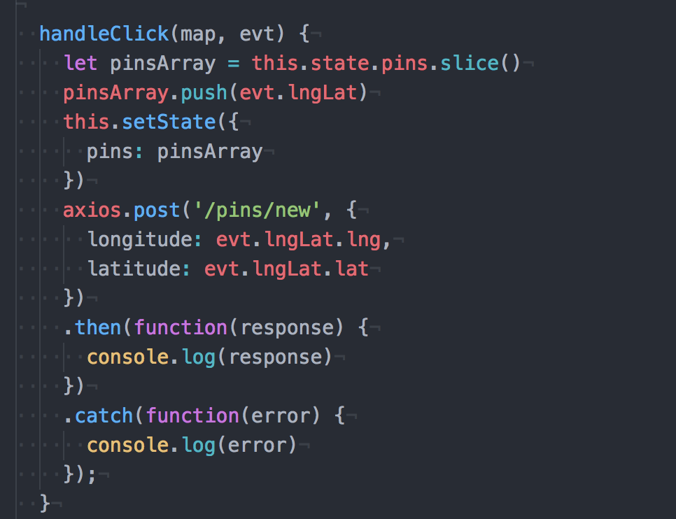 Our handleClick method is responsible for the post request. This is where, when one pin is made on the map, the coordinates are extracted and saved into our MongoDB database.