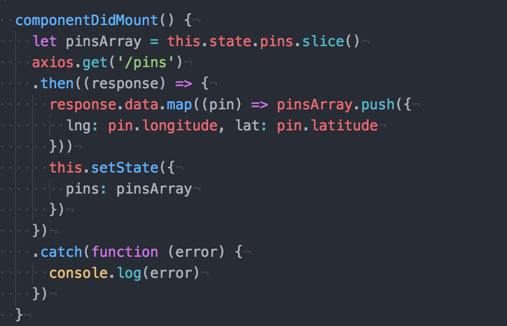 Then, here we are making a get request to all our pins (if there are any in the database) by iterating over the array of pin objects, and setting the values of coordinates to the right keys. After that, you are setting the result of the iteration of the copied pins array to the actual state known as pins.