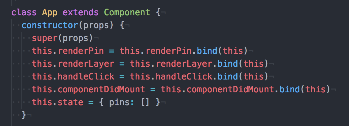 We then have our App Component, which binds all our methods to call. I suppose you could think this constructor works as when you initialise a class, it comes with all the values in it. Unlike javascript, you have to also initialise or what react calls “BIND” your methods when you call the App. We are also setting a state, pins as an empty array.