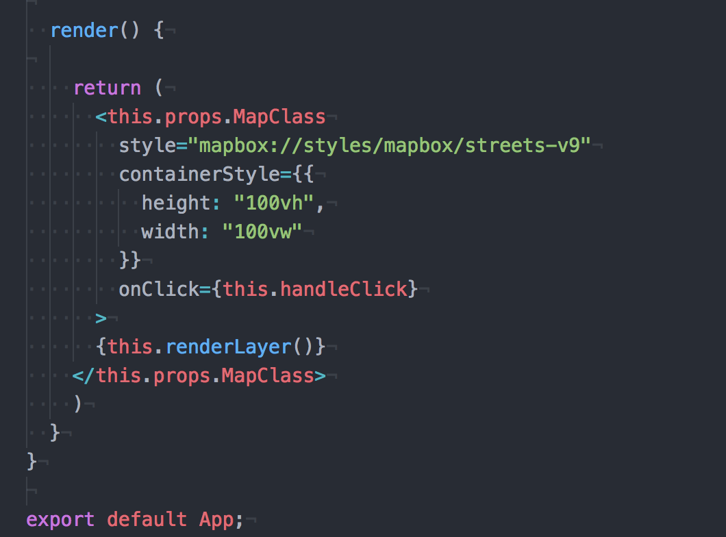 As I said earlier, this is the render method that is responsible for printing out the map. You have a prop class, which contains the Mapbox style and container Style. Container is where the map lives. We are then calling two other methods.