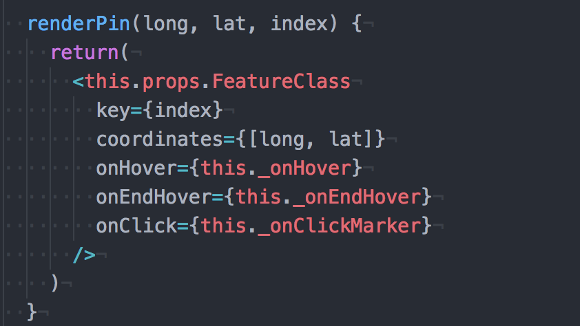 this.state.pins is an array of pin objects. In a pin object, is a hash with longitude and latitude as keys, with its values as coordinate numbers. Given we can have multiple coordinates (as I was saying), we need to iterate over this array of pin objects, to give out the longitude, latitude and surprisingly the index number. By giving it the index number, this allows us to have multiple points with different coordinates on the map.