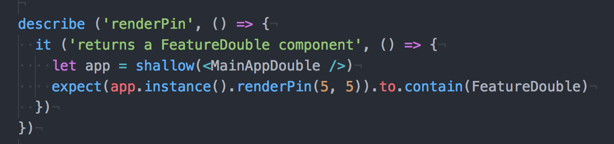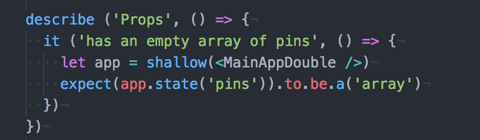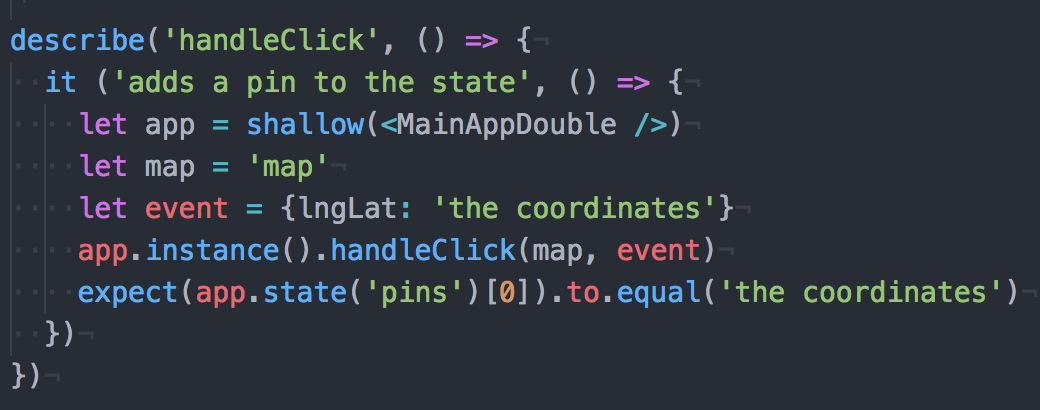 Lastly, we are testing whether the handling click method adds a pin to the state. To run all these tests, you just run npm tests in the command line.