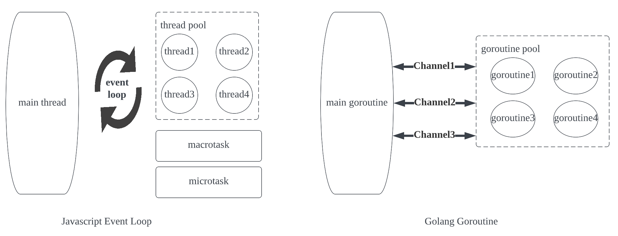 - Javascript threads communicate with the main thread via a constantly polling event loop while Golang goroutines communicate with each other via