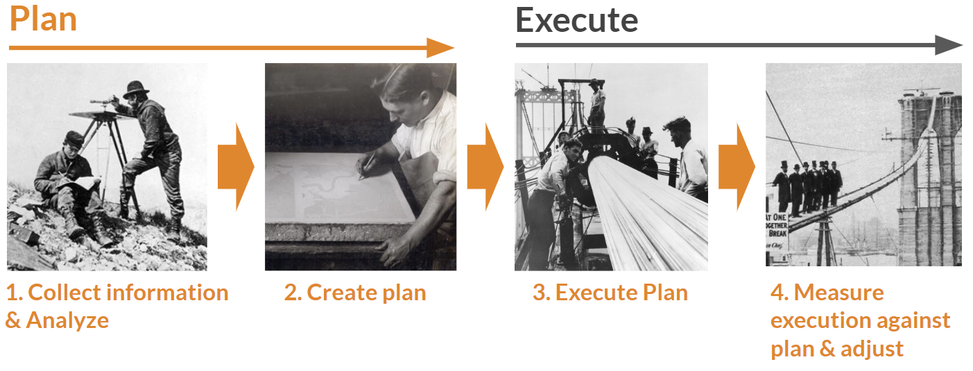 20th century business management, starting from Taylor’s Scientific management, embraced Plan & Execute as a core foundation. Managers were given the role of planners and employees the role of implementers. Phase-gate/waterfall, roadmaps, gantt charts, business plans and strategic plans are variations on the theme. Over time detailed plans became a prerequisite for funding and the yardstick for project progress. Success defined as completion of the project as planned, on time and within budget.