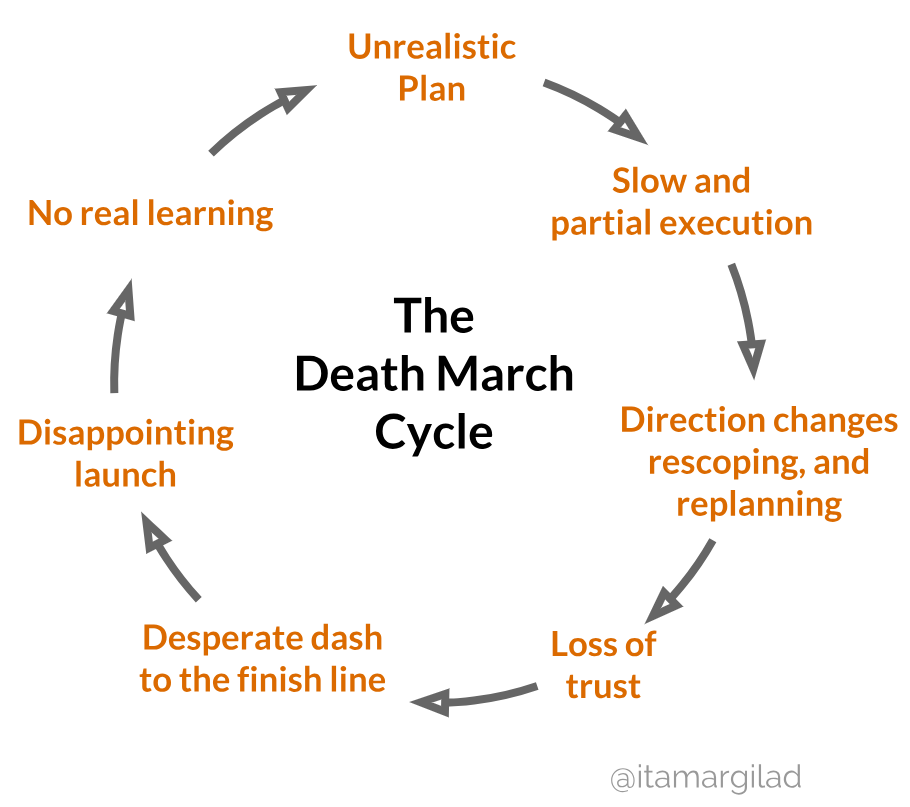 - Huge time and effort drain — as we have multiple, cascading levels of planning, it’s not uncommon for teams to spend half of the overall duration of the project just in planning and replanning. In large companies the effort involved is immense — just getting all stakeholders to agree is a momentous task.