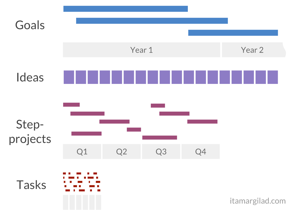 With GIST we decompose planning into four tiers: Goals, Ideas, Step-projects, and Tasks. Each has a different planning horizon and frequency of change, and may use different tools to track, but together they constitute all the core planning any company and team needs to do.
