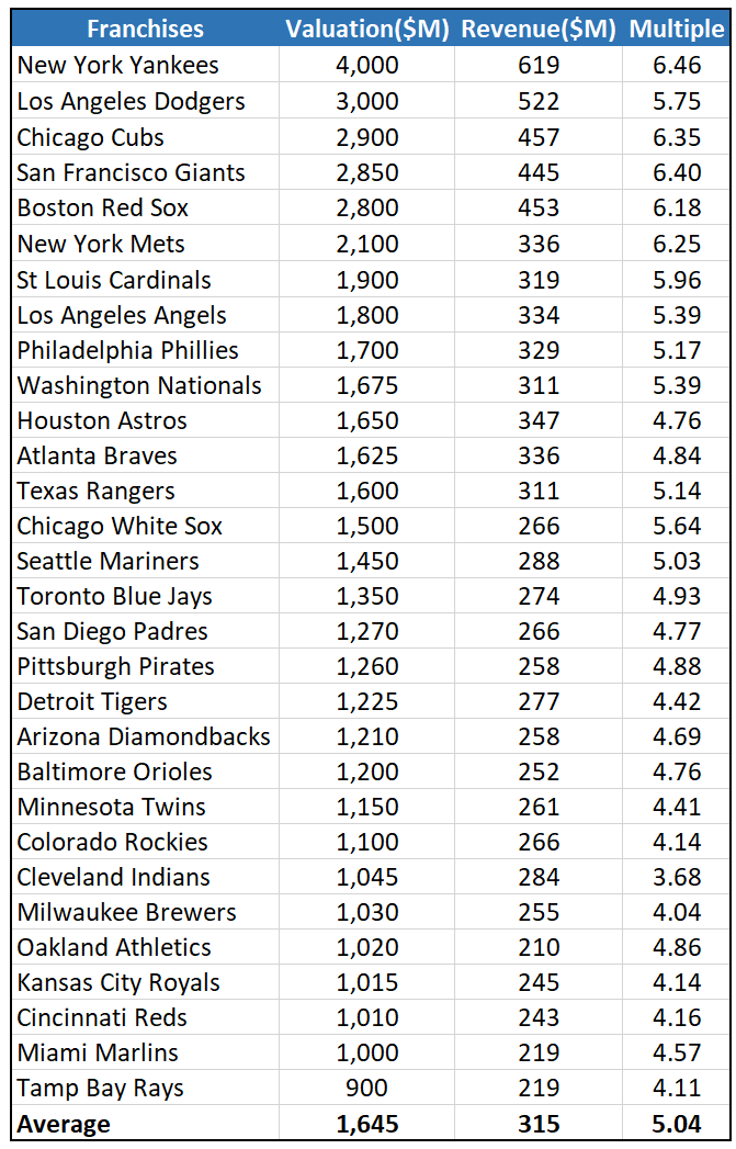 The MLB, America’s pastime, only averages a revenue multiple of 5.04x. The MLB puts on 5,460 regular season games a season and accounts for many franchises that have been around for over a century. Baseball has proven to pass the test of time but still only has a revenue multiple of 5.04x, which is 64% lower than the average top-tier esports organization revenue multiple of 13.8x (source: Forbes).