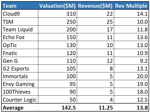 Based on the valuations that investors are paying for these teams, it shows a high demand for these assets at premium valuations. This is especially evident with organizations that are valued under $100M where you see revenue multiples at 20x (Immortals), 19x (Envy Gaming), and 18x (100 Thieves).