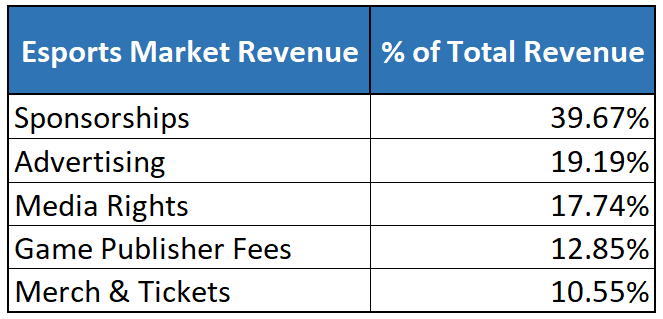 In the esports market today, there are a variety of revenue streams that contribute to the overall industry’s revenue which includes: sponsorships, advertising, media rights, game publisher fees, merchandise, tickets, and more. Esports organizations at present do not make public their revenue structure, though we’re confident that their current sources of revenue are similar to those of traditional professional sports teams.