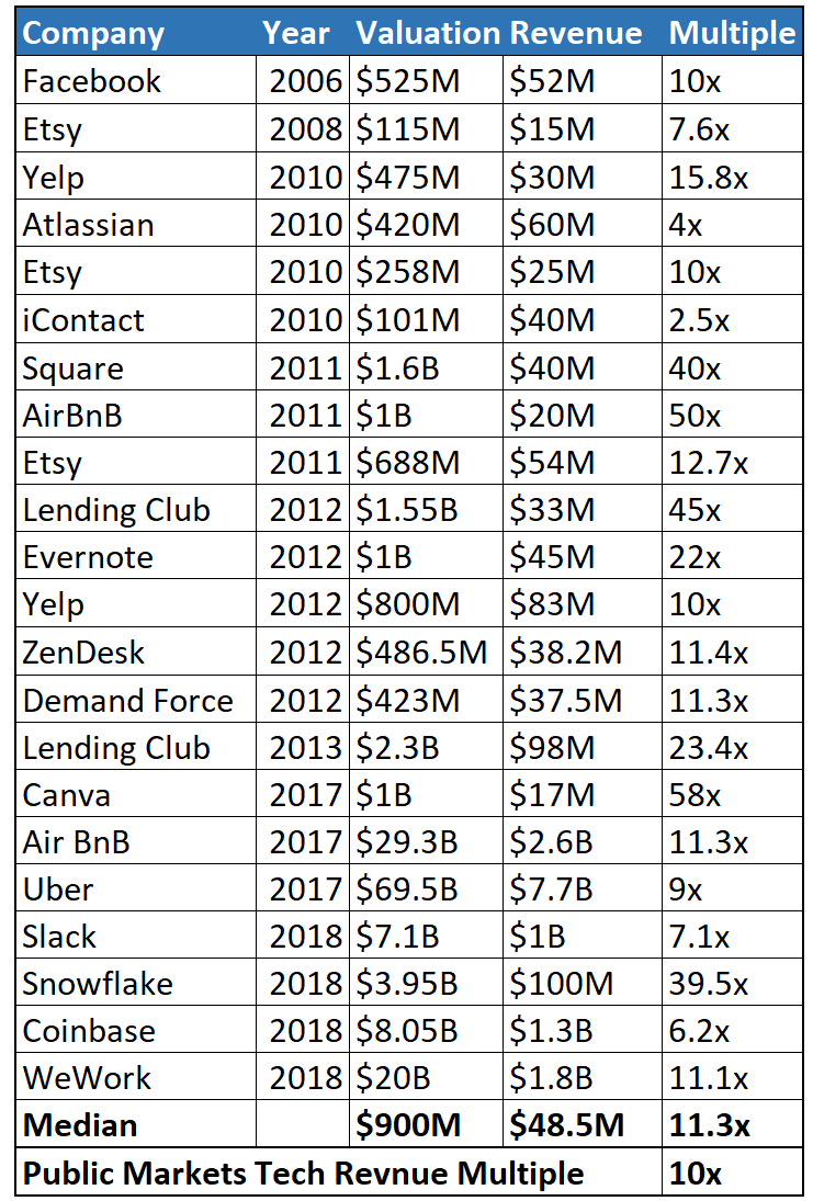 (Note: revenue, valuation, and their respective multiples represent estimates used in the rounds raised / exits in that current year)
