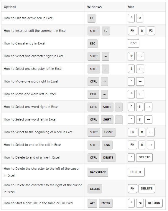 Cell Edit Mode Options Shortcuts: