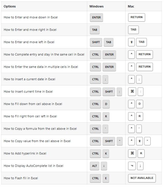 Entering Data Options Shortcuts: