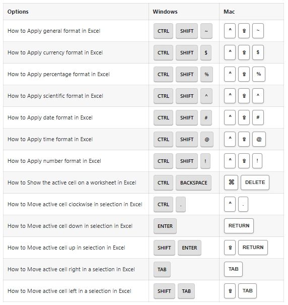 Number Formatting Options Shortcuts: