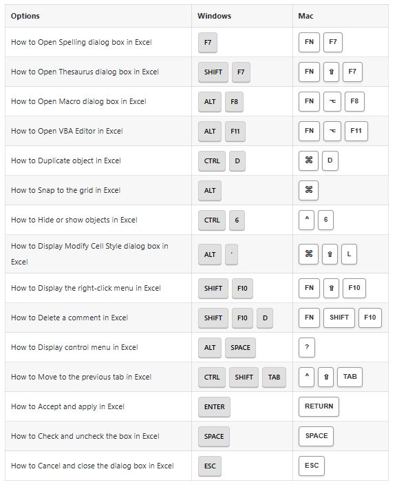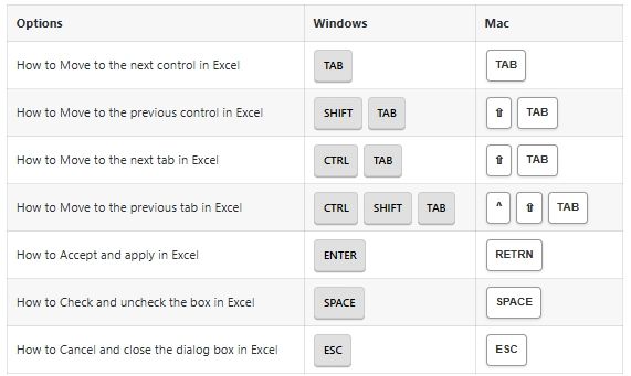 Dialog Boxes Options Shortcuts: