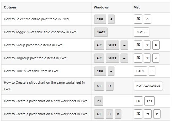 Pivot Tables Options Shortcuts:
