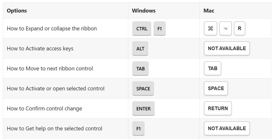 Ribbon Options Shortcuts: