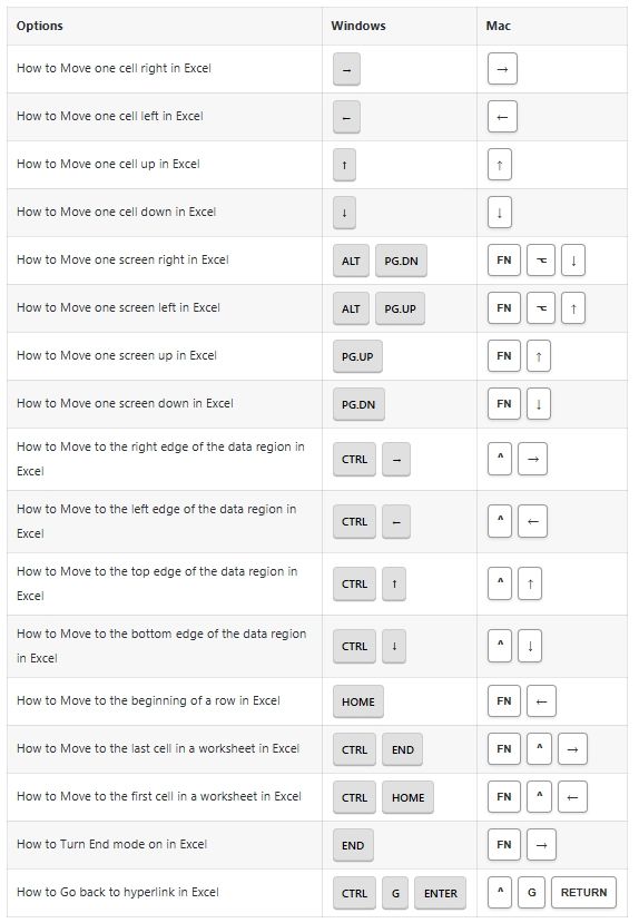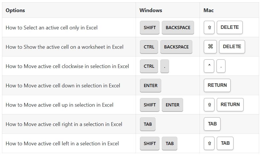 Active Cell Options Shortcuts: