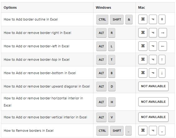 Border Options Shortcuts: