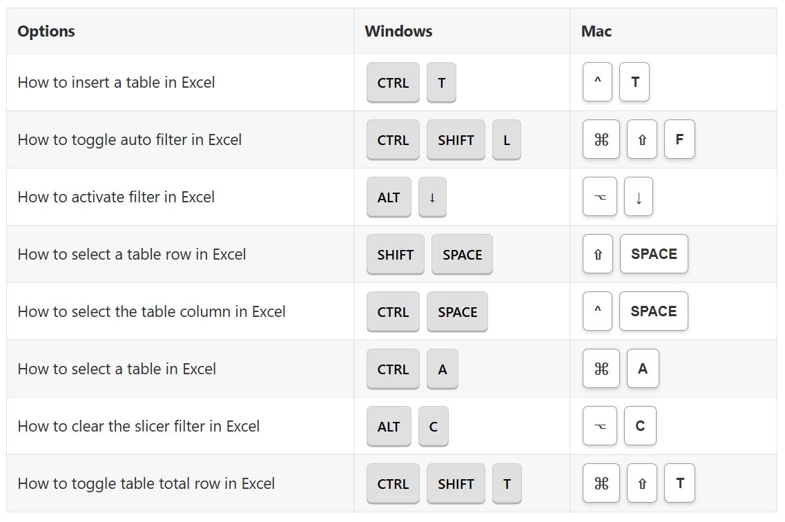 Table & Filters Options Shortcuts: