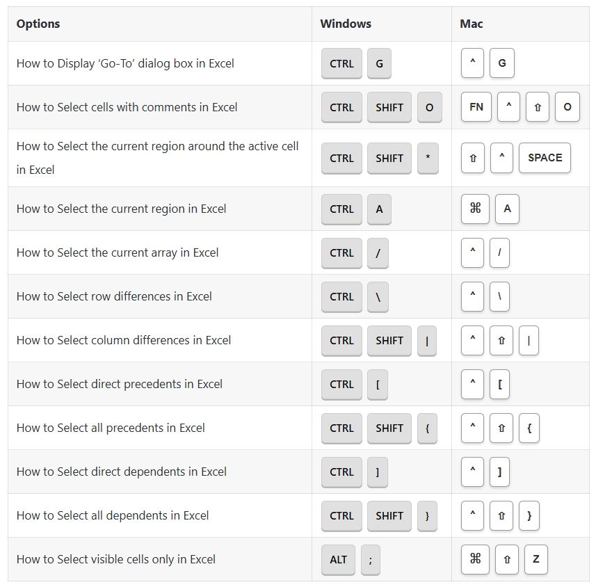 Select Special Options Shortcuts: