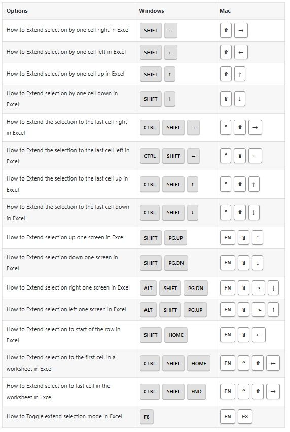 Extend Selection Options Shortcuts: