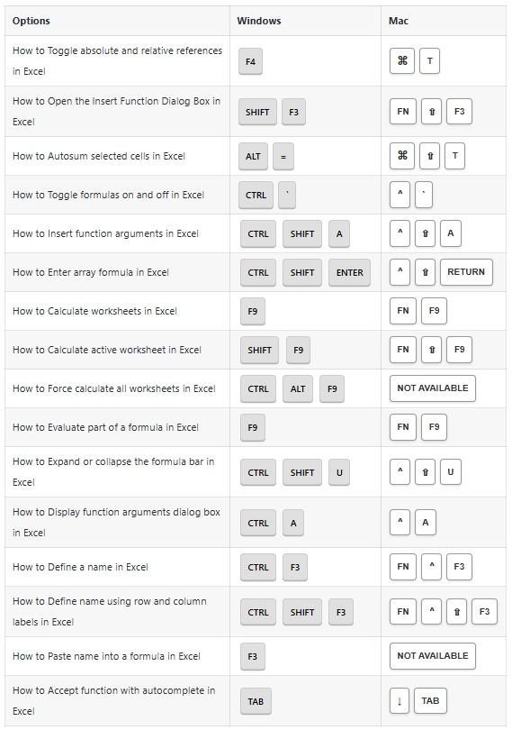 Formula Options Shortcuts: