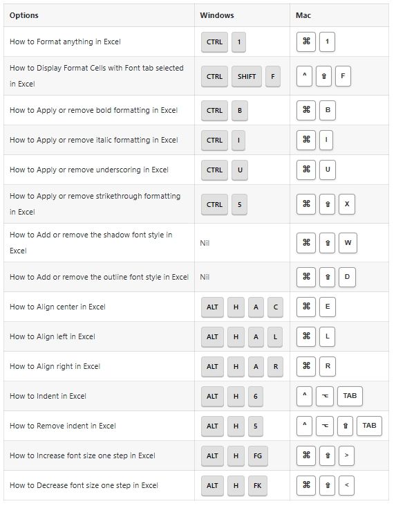 Formatting Options Shortcuts:
