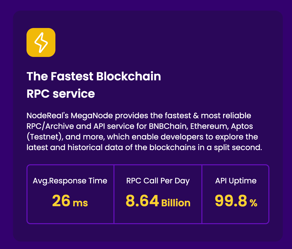 NodeReal is a one-stop infrastructure and solution provider that embraces the high-speed blockchain era. We provide scalable, reliable, and efficient blockchain solutions for everyone, aiming to support the adoption, growth, and long-term success of the Web3 ecosystem.