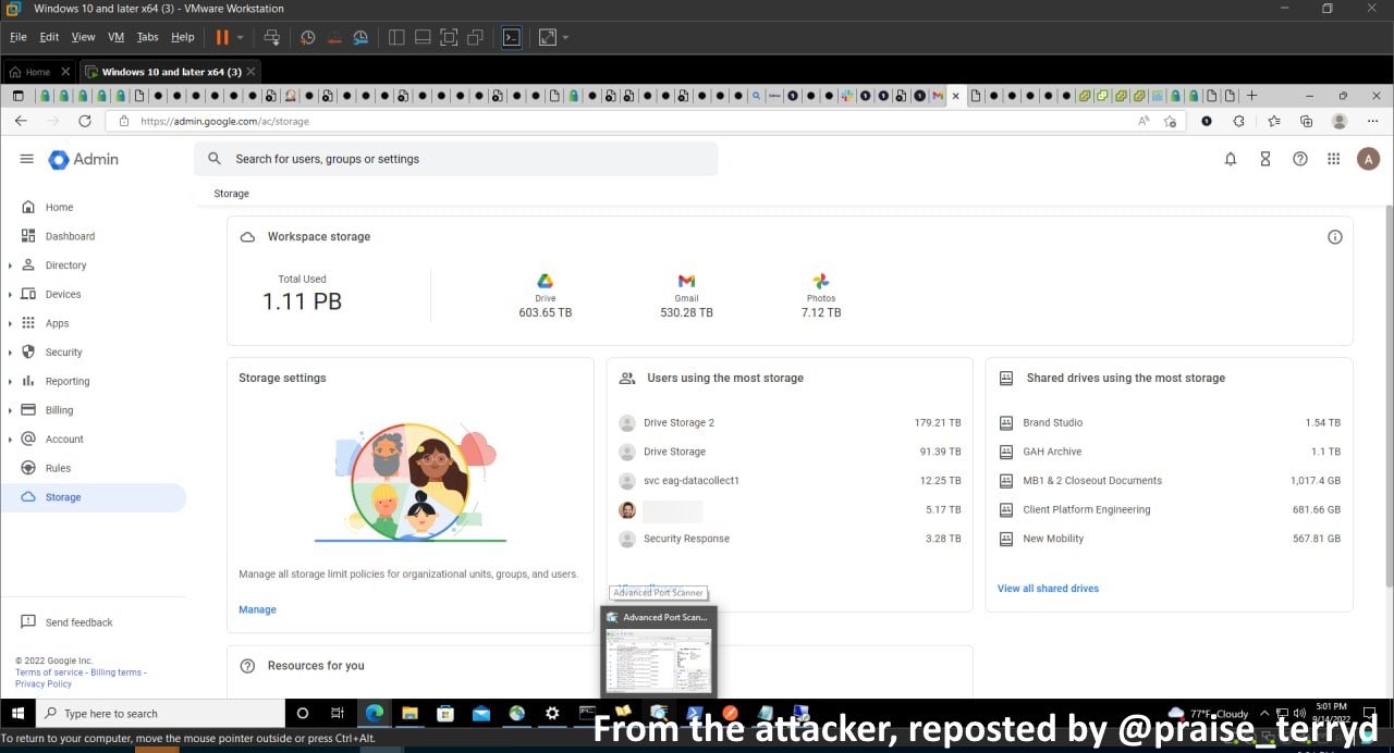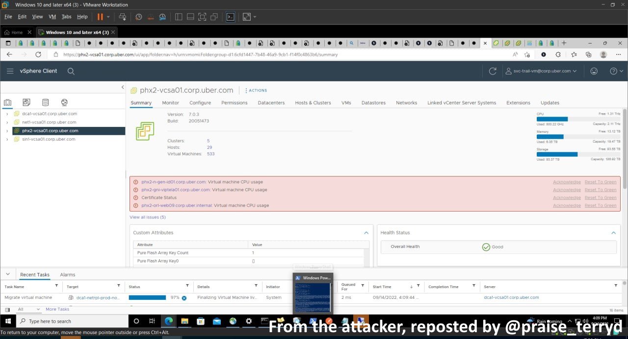 The systems accessed include the company's Slack server, Amazon Web Services console, VMware vSphere/ESXi virtual machines, and the Google Workspace admin dashboard for managing the Uber email accounts. He shared screenshots to establish the breach.