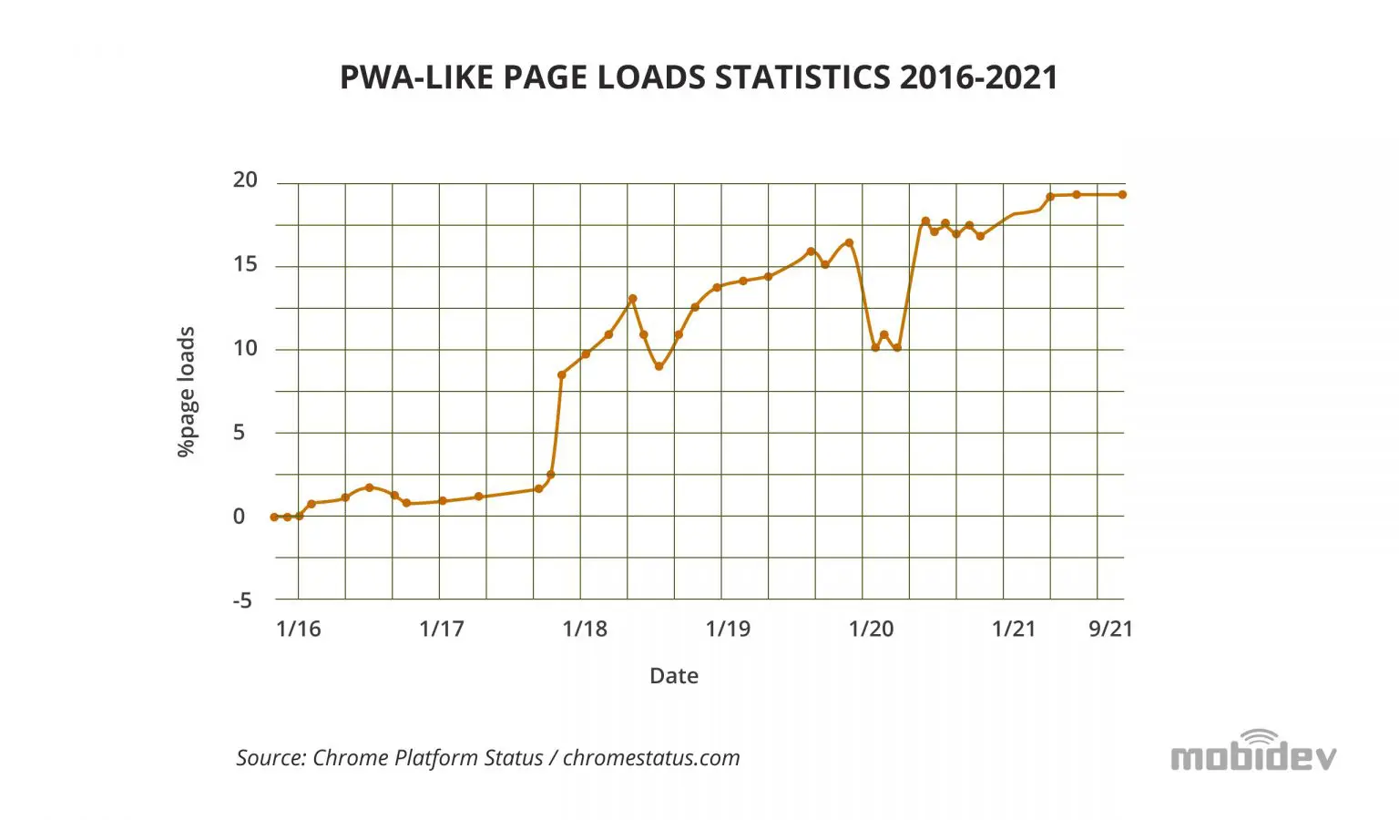 Progressive web apps are, by their nature, an evolving trend. As such, new developments and added support by major platforms are constantly contributing to the growth of PWAs. While the imprecise definition of PWA makes it difficult to track an exact market share, estimates based on Chrome web statistics put the current number of PWA-like page loads at about 19%.