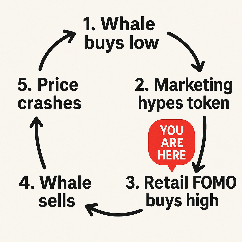 “Exit liquidity” is the moment your money - new retail cash, floods the market, giving whales their chance to sell high and cash out. They walk away with millions; you’re left clutching a token that’s suddenly worth pennies.