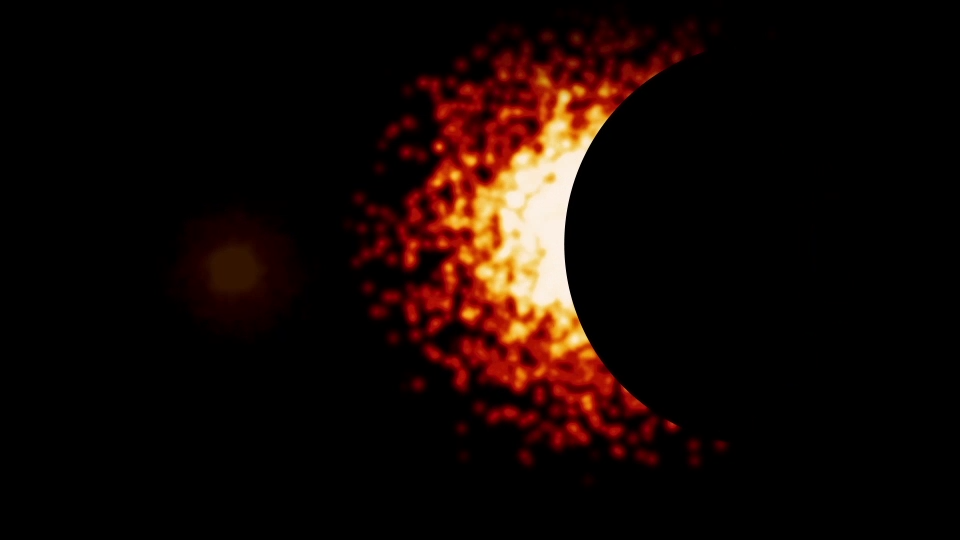 Another challenge is the huge contrast between the brightness of the exoplanet and its host star, which is ten billion times brighter. To solve this problem, coronagraphs are used to suppress the light from the star. Direct imaging, like the transit method, will allow us to determine the composition of exoplanet atmospheres. The first and so far most detailed photograph taken by the James Webb Space Telescope in 2022 looks like this: