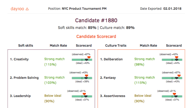 Since we were experimenting with a new kind of hiring process where we hid candidate’s names and even resumes, we wanted to give employers a chance to learn more about candidates, so we turned to our friends at Day100, a psychology-based hiring technology platform that works off the Big Five personality framework that is most widely accepted by psychologists.