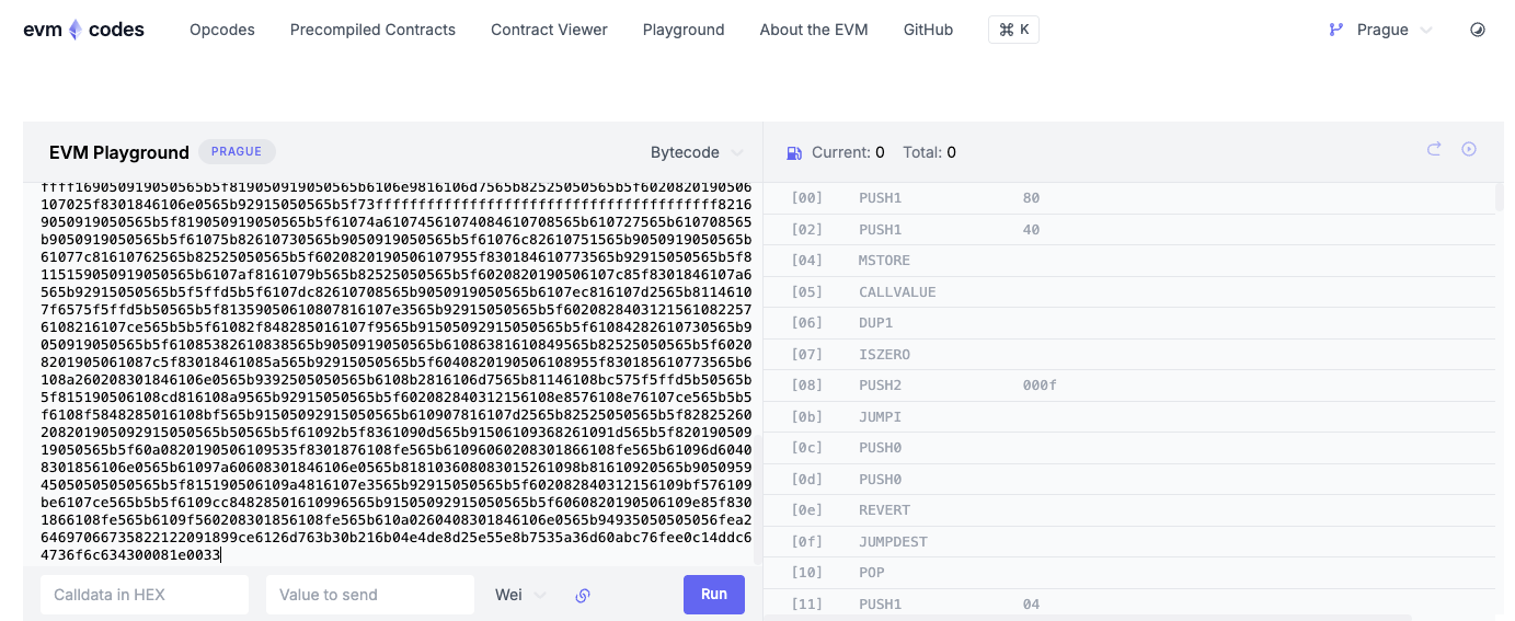 To deploy this contract, we need to craft creation bytecode. Let's modify the existing creation code. The bytecode value in artifacts contains it at the beginning. Here's mine: 0x6080604052348015600e575f5ffd5b50610c468061001c5f395ff3fe. Disassembling it shows: