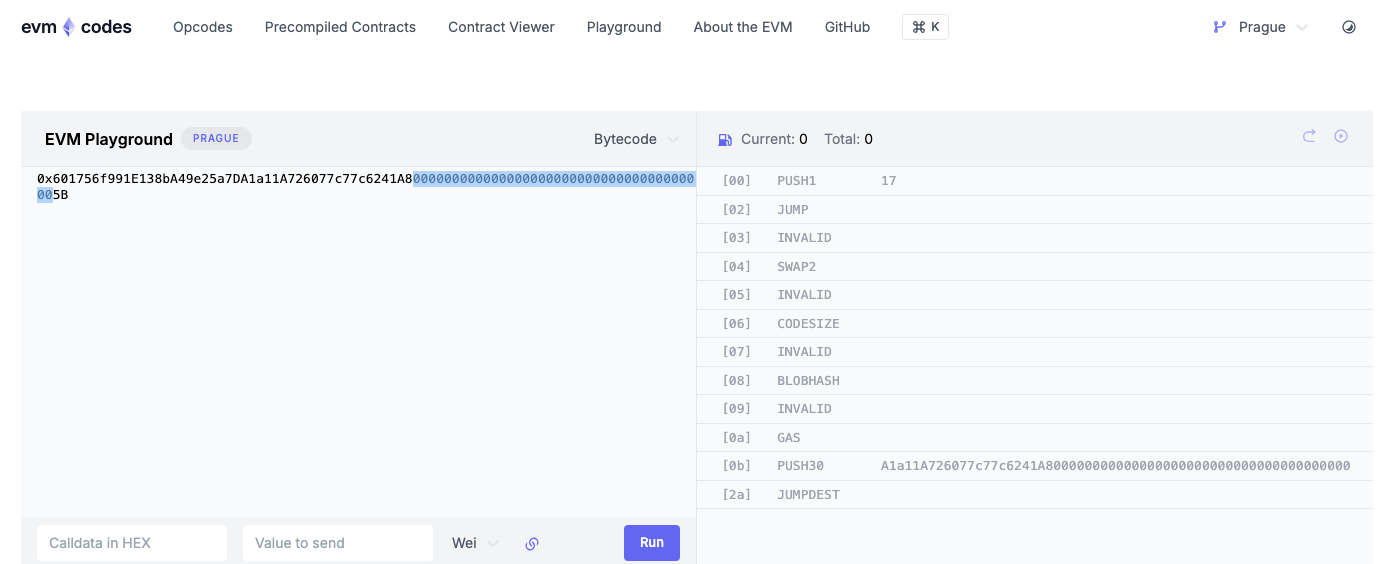 0x602a56f991E138bA49e25a7DA1a11A726077c77c6241A8000000000000000000000000000000000000005B<attack-bytecode>