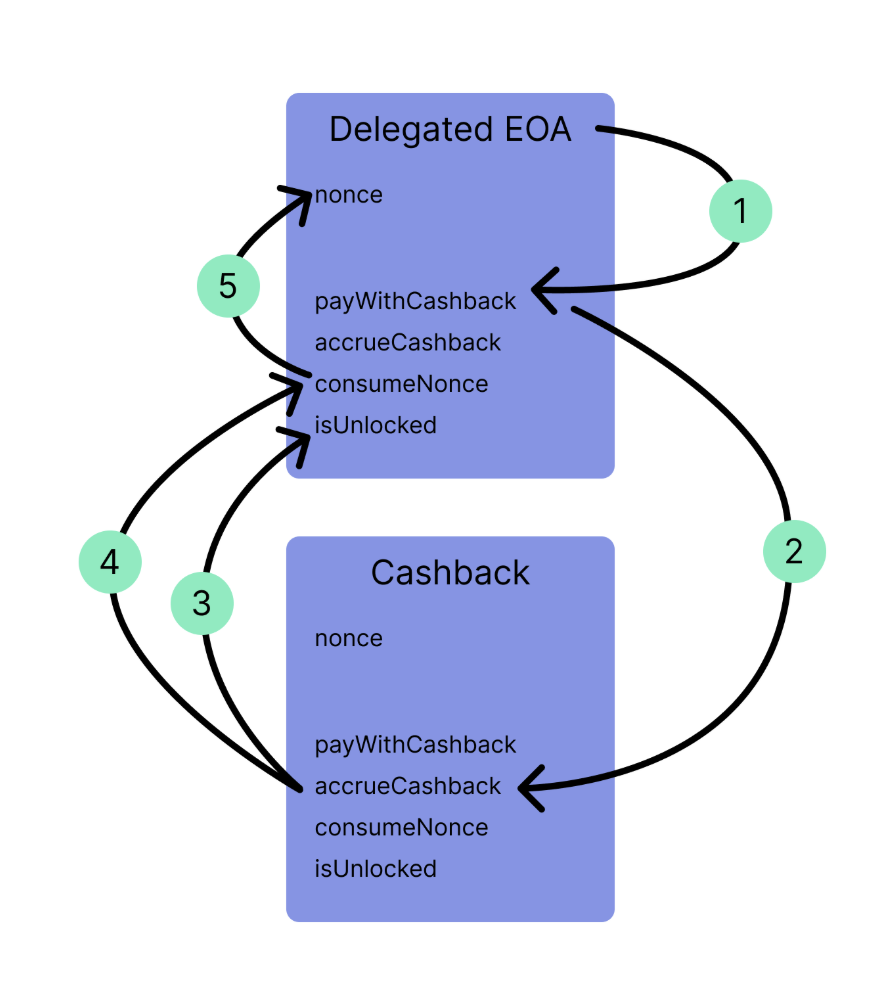 The system leverages EIP-7702 to allow EOAs to accrue cashback. Users must delegate to the Cashback contract to use the