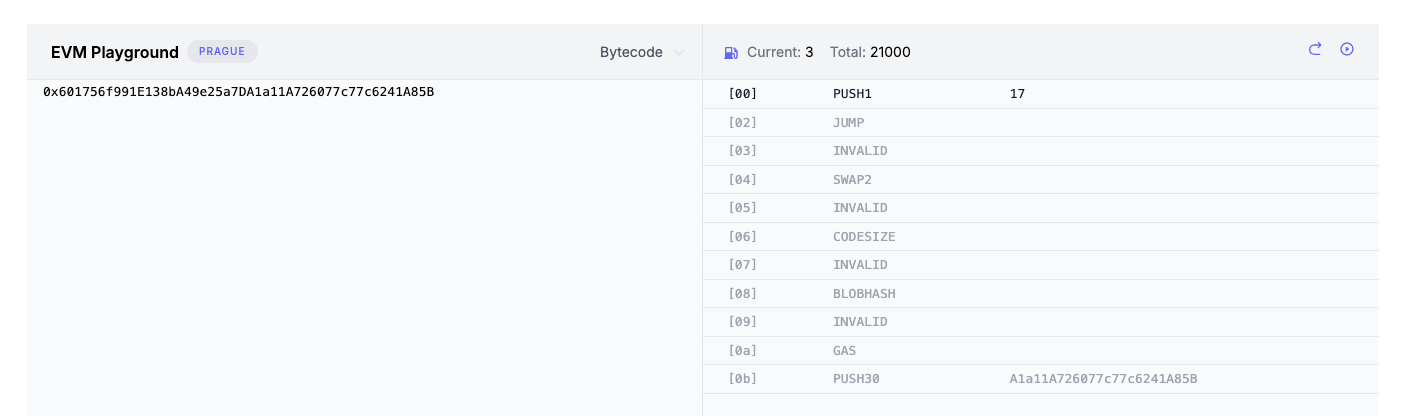 Problem! The byte 0x7D in our instance address is the PUSH30 opcode. When the EVM encounters PUSH30, it consumes the following 30 bytes as literal arguments, not as instructions. My JUMPDEST (5B) is positioned at offset 0x17, but it gets consumed as data for PUSH30 instead of being executed as an instruction. This corrupts the bytecode stream, causing an EVM error: InvalidJump when execution reaches that location.