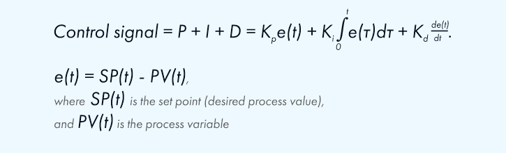 To calculate a control signal, the PID algorithm uses three control terms – proportional, integral, and derivative. Each component is multiplied by a gain that is used to adjust the weight of each term in the equation. This way, engineers can tune a PID controller to suit a particular process. Read our previous article to learn the basics of PID controllers.
