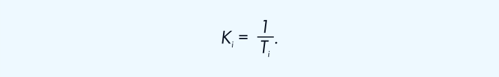 The most essential of the three control terms – and the most confusing one – is probably the integral term. There are two popular but mutually inverse representations of the integral gain. One (Ki) is often used in academic practice while the other (Ti) is more common for engineering practice. They are related by the following equation: