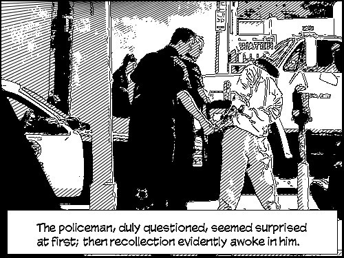 In 2014, Greg Borenstein wrote a comic generator called Generative Detective, producing comics from public-domain detective novels & creative commons licensed Flickr images. He used a semi-manual process, tagging sentences with keywords which he then used to search for associated images. The result: a surreal but compelling comic composed of juxtapositions.