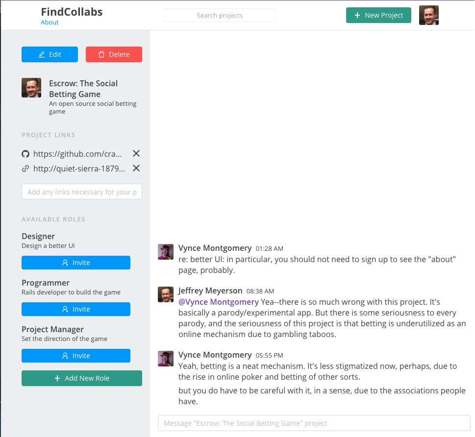 FindCollabs is a place to share your projects, whether those projects are new or old. Your project doesn’t even have to have code associated with it yet — it can just be an idea, like a weather prediction system.